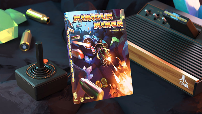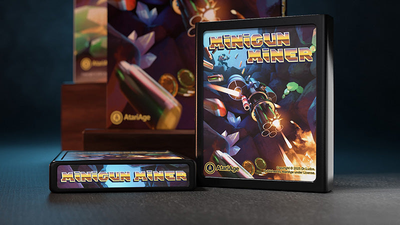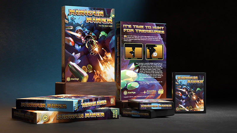 Included with Minigun Miner is the game cartridge, full color, 16-page manual, and professionally printed box. Miniguns Miner is available in NTSC and PAL60 television formats. Please select above when ordering. If you do not make a selection, you will receive an NTSC copy of the game by default.
