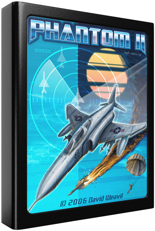 Phantom II / Pirate is a homebrew cartridge featuring two games written by David Weavil. Phantom II is based on an old Bally Midway arcade game of the same name, where your goal is to patrol the unfriendly skies and shoot down enemy bombers! In Pirate, you must explore a dangerous island and find the treasure of evil pirate Chuck DeLuc! The cartridge features a menu that lets you select which game to play upon powering up your system.